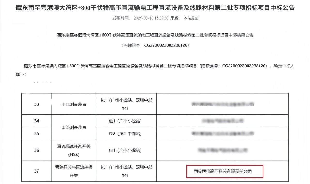 (陸平)近日,西開有限成功中標(biāo)南方電網(wǎng)藏東南至粵港澳大灣區(qū)±800千伏特高壓直流輸電工程受端換流站旁路開關(guān)、直流轉(zhuǎn)換開關(guān)項目。此次中標(biāo)不僅是南方電網(wǎng)對西開有限技術(shù)實力與產(chǎn)品品質(zhì)的高度認(rèn)可,更是企業(yè)在特高壓直流裝備領(lǐng)域深耕細(xì)作、持續(xù)突破的重要成果。